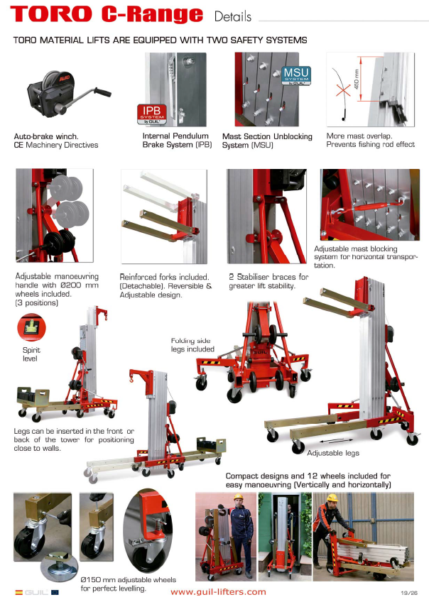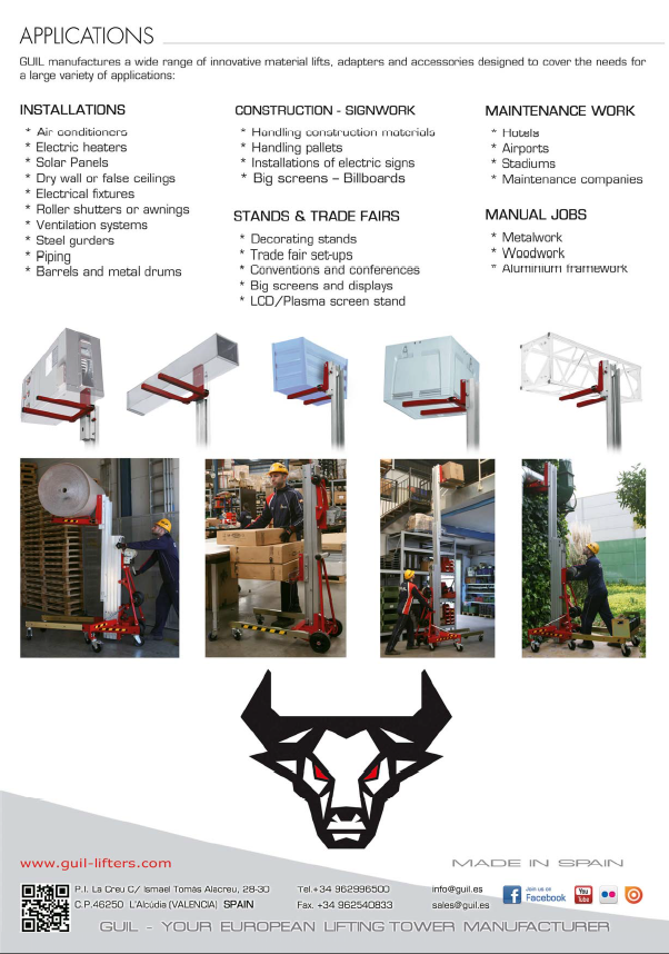 Η κατασκευή είναι ένας τεράστιος συνδυασμός αμέτρητων διαφορετικών εργασιών με ένα σύνθετο τελικό προϊόν και οι εξαιρετικά ευέλικτοι ανυψωτές TORO και ELC της GUIL μπορούν να βοηθήσουν σε πολλές από αυτές τις εργασίες, πραγματοποιώντας τις πιο γρήγορα και αποτελεσματικά και με μεγαλύτερη ασφάλεια. Ανύψωση βαρέων ή μεγάλων αντικειμένων, ανακαινίσεις, βοήθεια στην εγκατάσταση αγωγών, χαλύβδινων δοκών ή κράτημα καμερών ασφαλείας ή φωτισμού στο χώρο τη νύχτα, αυτά είναι μερικά μόνο παραδείγματα. Η GUIL είναι πεπεισμένη ότι έχει τη λύση που θα επιτρέψει στις επαγγελματικές κατασκευαστικές εταιρείες να κάνουν την καλύτερη δουλειά και να παράγουν το καλύτερο τελικό προϊόν.