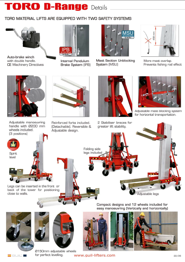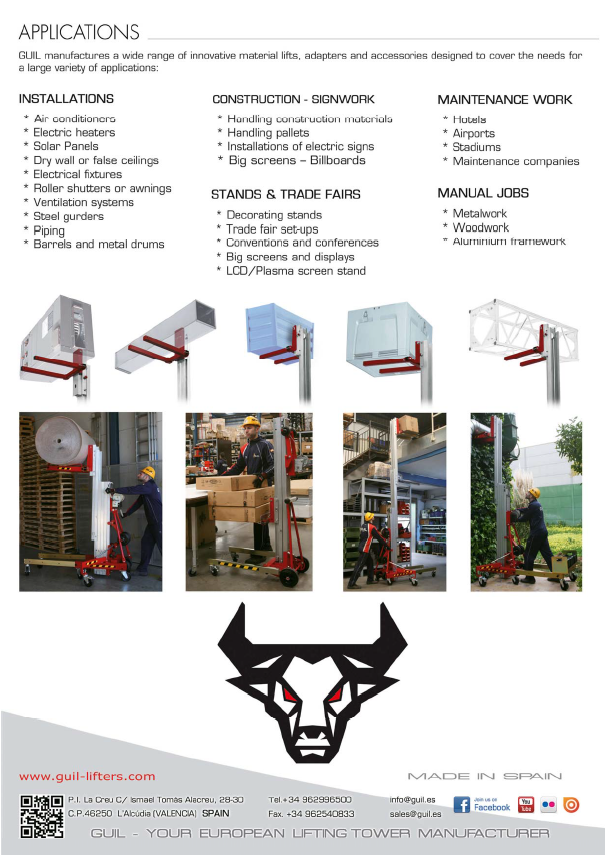 Η κατασκευή είναι ένας τεράστιος συνδυασμός αμέτρητων διαφορετικών εργασιών με ένα σύνθετο τελικό προϊόν και οι εξαιρετικά ευέλικτοι ανυψωτές TORO και ELC της GUIL μπορούν να βοηθήσουν σε πολλές από αυτές τις εργασίες, πραγματοποιώντας τις πιο γρήγορα και αποτελεσματικά και με μεγαλύτερη ασφάλεια. Ανύψωση βαρέων ή μεγάλων αντικειμένων, ανακαινίσεις, βοήθεια στην εγκατάσταση αγωγών, χαλύβδινων δοκών ή κράτημα καμερών ασφαλείας ή φωτισμού στο χώρο τη νύχτα, αυτά είναι μερικά μόνο παραδείγματα. Η GUIL είναι πεπεισμένη ότι έχει τη λύση που θα επιτρέψει στις επαγγελματικές κατασκευαστικές εταιρείες να κάνουν την καλύτερη δουλειά και να παράγουν το καλύτερο τελικό προϊόν.