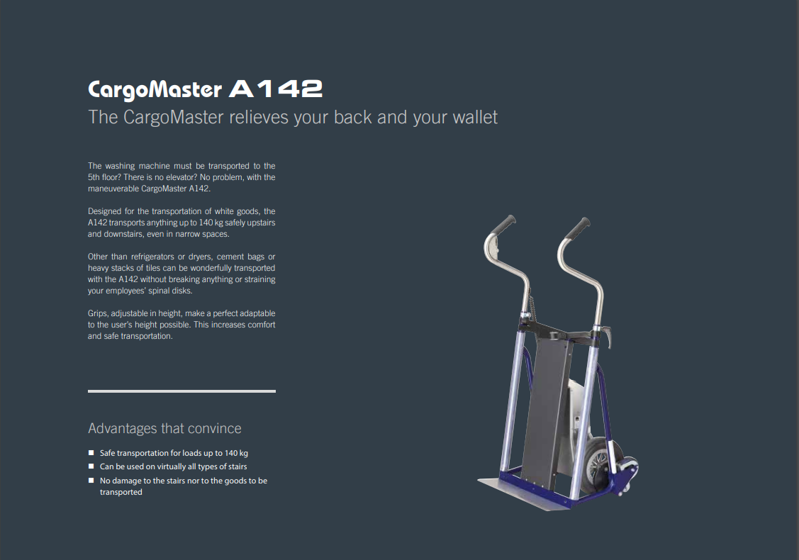 Το CargoMaster δεν βοηθά μόνο στη μετακίνηση εμπορευμάτων από τις σκάλες, αλλά είναι επίσης ιδανικό για φόρτωση και εκφόρτωση. Το CargoMaster A142 είναι κατάλληλο για σχεδόν όλες τις σκάλες, είτε είναι εσωτερικές είτε εξωτερικές.