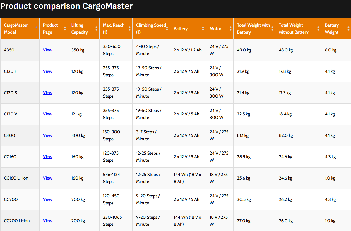 Οι αναρριχητές σκάλας της σειράς CC-LI-ION με την τελευταία τεχνολογία μπαταριών ιόντων λιθίου και την καινοτόμο τεχνολογία Bosch AMPShare αποτελούν την ιδανική λύση για τη μεταφορά μεσαίων και ογκωδών φορτίων. Το χαμηλό βάρος, η απλή λειτουργία και οι ισχυρές, γρήγορης φόρτισης μπαταρίες καθιστούν το CargoMaster ένα απαραίτητο εργαλείο