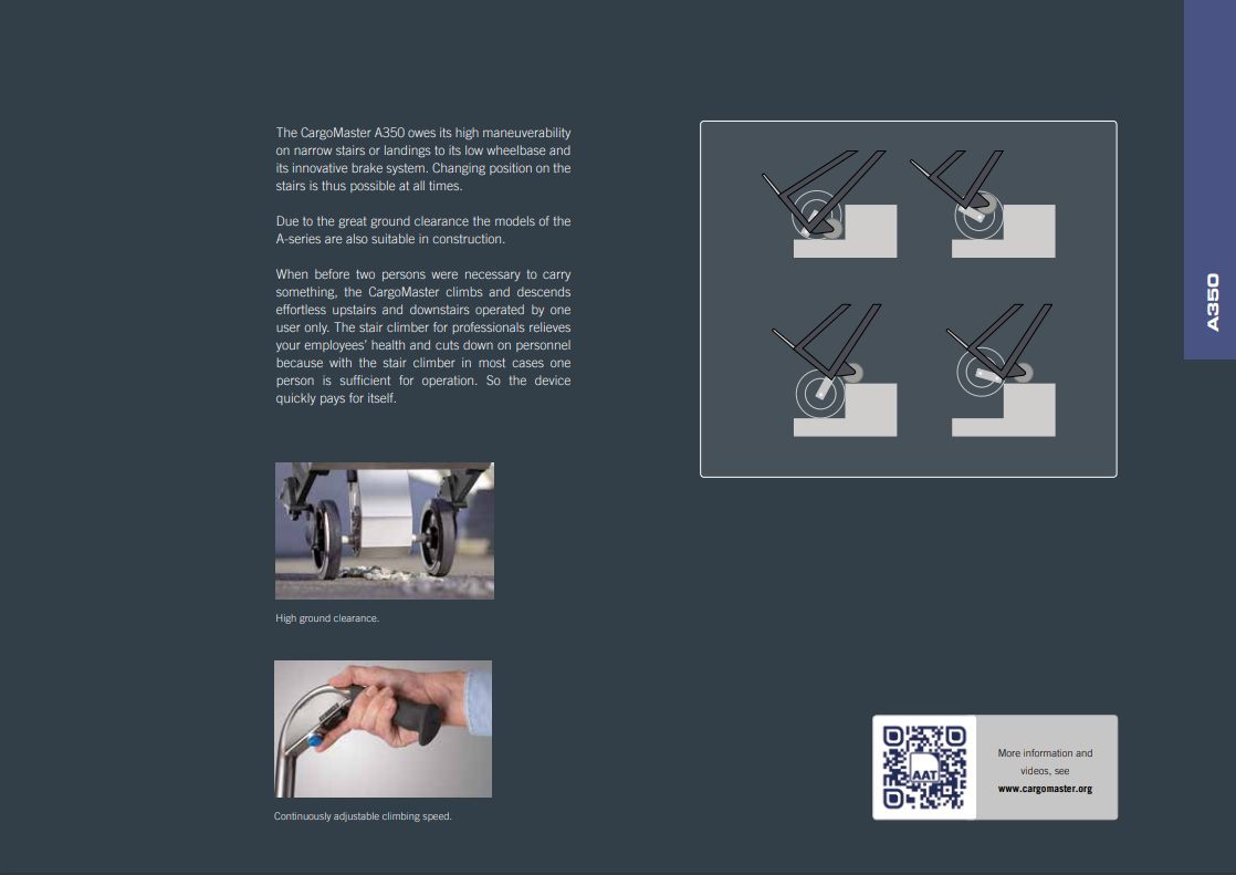 - Το CargoMaster μπορεί να μεταφέρει σχεδόν όλα τα βαριά φορτία πάνω στις σκάλες γρήγορα, αξιόπιστα και με απλό τρόπο χωρίς ουσιαστικά καμία προσπάθεια.