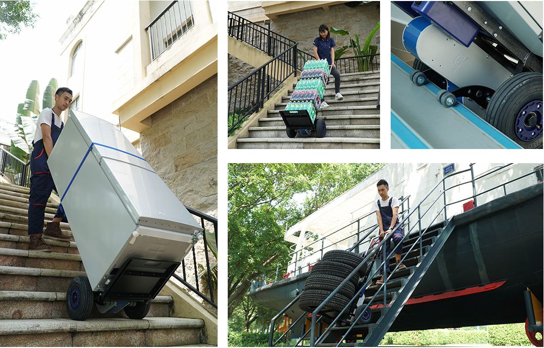 Αυτό το ηλεκτρικό καρότσι με φουσκωτούς τροχούς μπορεί να χρησιμοποιηθεί για τη μεταφορά φορτίου έως 170Kg πάνω και κάτω σκάλες. Είναι κατάλληλο για βιομηχανικό και εμπορικό υλικό, δομικά υλικά, βαριές συσκευές και άλλα προϊόντα χωρίς καμία προσπάθεια. Το ενισχυμένο πλαίσιο από ανθρακούχο χάλυβα, ο απλός έλεγχος κουμπιού αφής, η επαναφορτιζόμενη μπαταρία, και η εξαιρετικά χαμηλή τιμή του ,το καθιστούν όλο και πιο δημοφιλές σε μεταφορές αντικειμένων πάνω και κάτω στις σκάλες χωρίς κόπο.