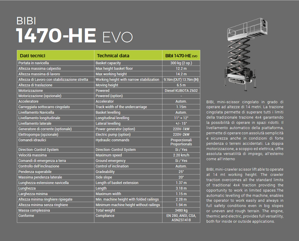 - Η Almac και η ομάδα εξειδικευμένων επαγγελματιών της ασχολούνται με το σχεδιασμό και τη διανομή του ψαλιδιού Bibi 1470-HE EVO, ενός μοντέλου εξοπλισμένου με κινητήρα Kubota, το οποίο θα σας εγγυηθεί να λειτουργεί με ασφάλεια, χάρη και στους σταθεροποιητές του, έως και ύψος 14 μέτρα.