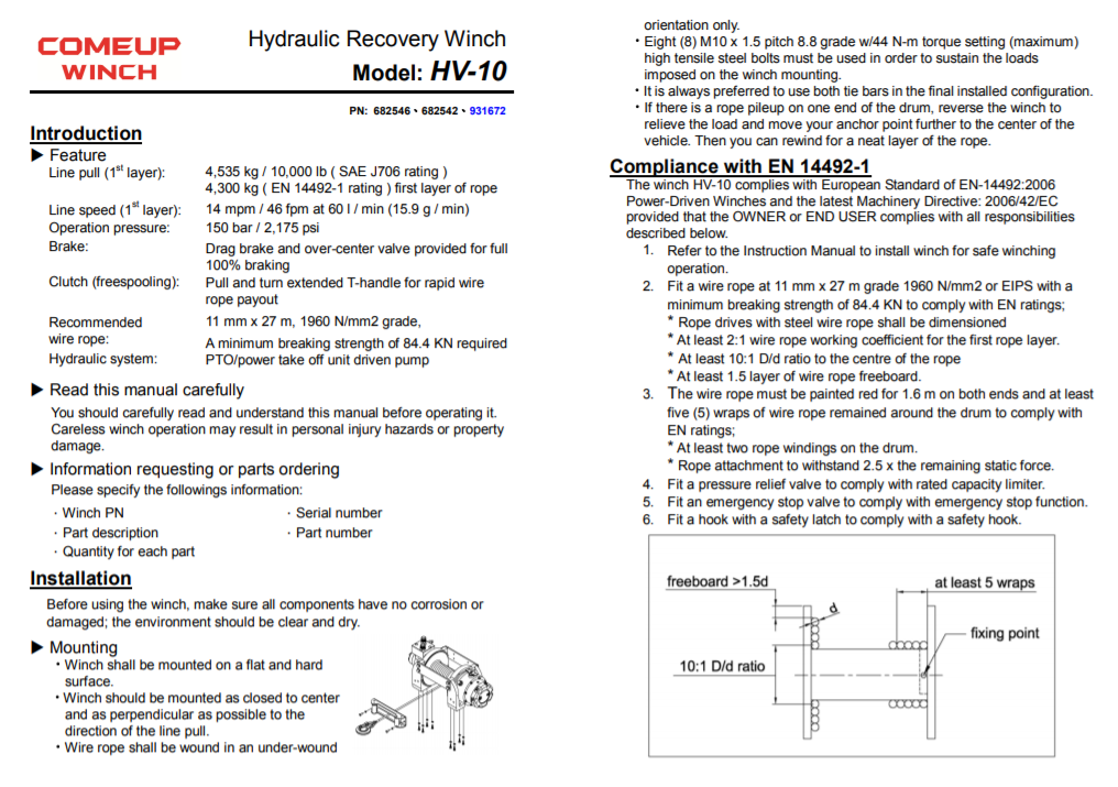 - Υποστηρίζεται EN 14492-1: Αναλογία D / d 10: 1 και δύναμη σχοινιού καλωδίων 2: 1 επιτρέπουν τα βαρέα οχήματα και την εμπορική ανάκτηση