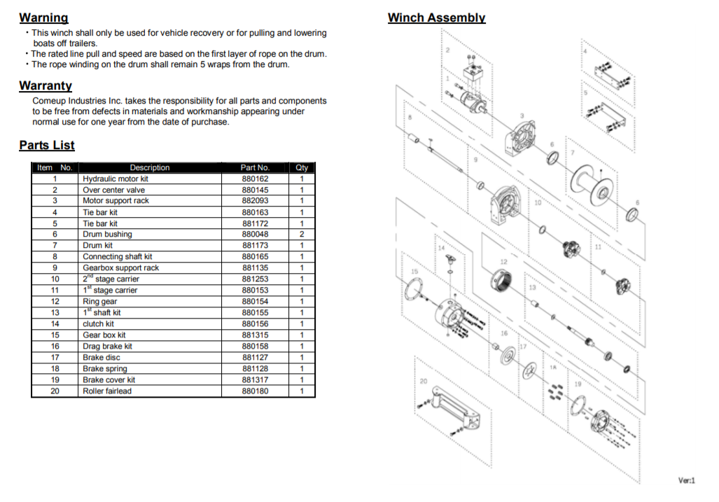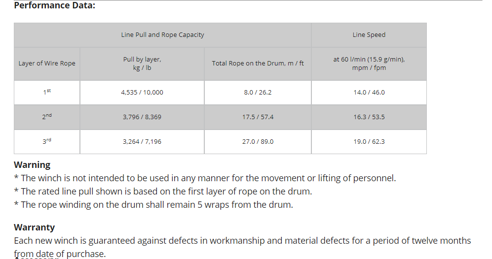 11 mm x 27 m (7/16 “x 89 ‘), 1,960 N / mm2 (EIPS) με ελάχιστη αντοχή στη θραύση 84,4 kN (18,939 lbf) που απαιτείται για τις βαθμολογίες SAE J706 και EN 14492-1. - Βάρος του βαρούλκου: 37 kg / 81,4 lb