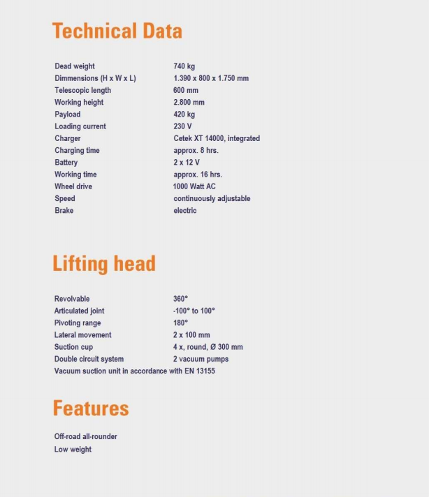 Είναι εξοπλισμένο με 4 βεντούζες και ανυψώνει έως 420 κιλά.