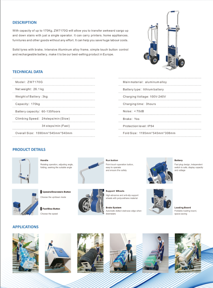 - Με δυνατότητα ανύψωσης 170 kg, το ZW7170G είναι ένα μηχανοκίνητο καροτσάκι για μεταφορά φορτίου πάνω από σκάλες με έναν μόνο χειριστή.