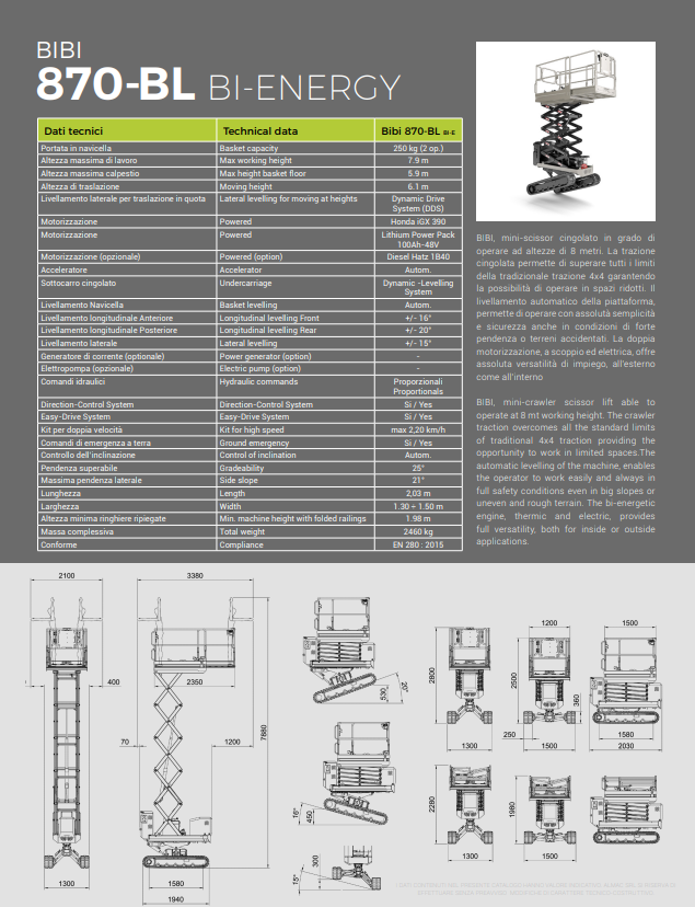 Η τελευταία προσθήκη στη σειρά μηχανημάτων Almac, το ανυψωτικό ψαλιδιού Bii Energy Bibi 870-BL με ηλεκτρο-υδραυλικό σύστημα και σύστημα δύο επιπέδων έχει σχεδιαστεί για να λειτουργεί σε ύψος έως 7,90 μέτρα. Επιπλέον, η χρήση του θα είναι σε θέση να εγγυηθεί τη μέγιστη ασφάλεια των χειριστών του.