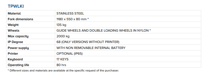 Παλετοφόρο με ζυγαριά από ανοξείδωτο ατσάλι με ενσωματωμένη ηλεκτρονική ζύγιση πολλαπλών σειρών, εύχρηστη Ανίχνευση βάρους με τέσσερις κυψέλες ανοξείδωτου IP68. Ανθεκτική κατασκευή κατάλληλη για σκληρές συνθήκες εργασίας. Κατασκευάστηκε, βαθμονομήθηκε και προσαρμόστηκε στην Ιταλία από τον Dini Argeo, χρησιμοποιώντας πιστοποιημένες μάζες δείγματος. Διατίθεται επίσης ΕΓΚΡΙΣΗ CE-M.