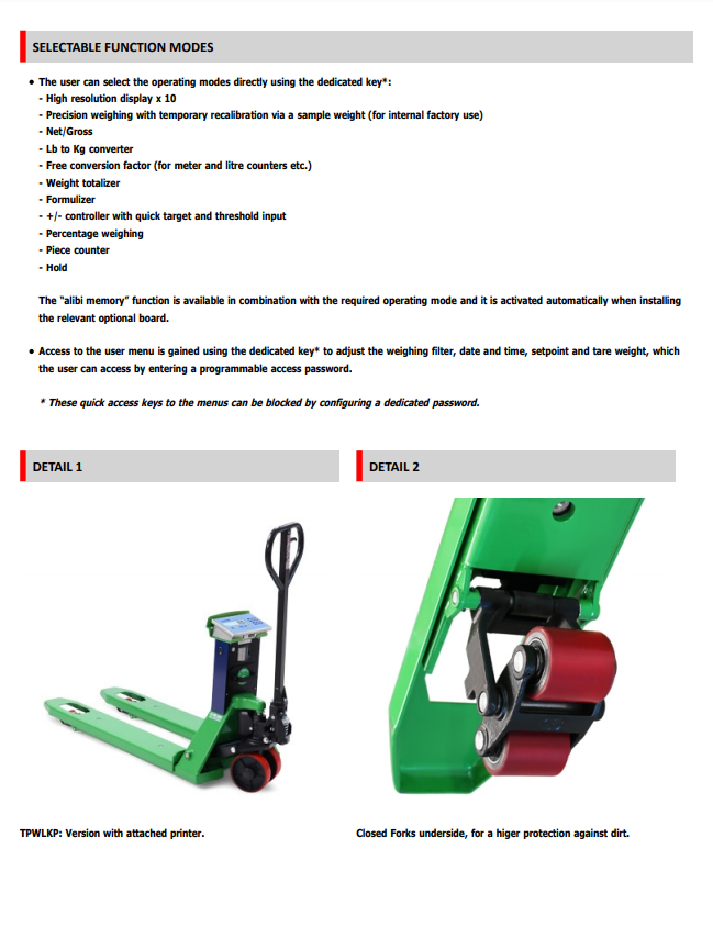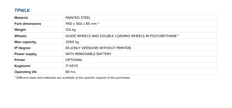 Παλετοφόρο με ενσωματωμένη ηλεκτρονική ζύγιση, αξιόπιστες, εύχρηστες, κατάλληλες για σκληρές συνθήκες εργασίας. Αυτά είναι απαραίτητα για όσους πρέπει να ζυγίζουν με ακρίβεια αλλά και να εξοικονομούν χρόνο. Εξοπλισμένο με επαναφορτιζόμενη αποσπώμενη μπαταρία.Με ενσωματωμένο εκτυπωτή*.Κατασκευάστηκε, βαθμονομήθηκε και προσαρμόστηκε στην Ιταλία από τον Dini Argeo, χρησιμοποιώντας πιστοποιημένες μάζες δείγματος