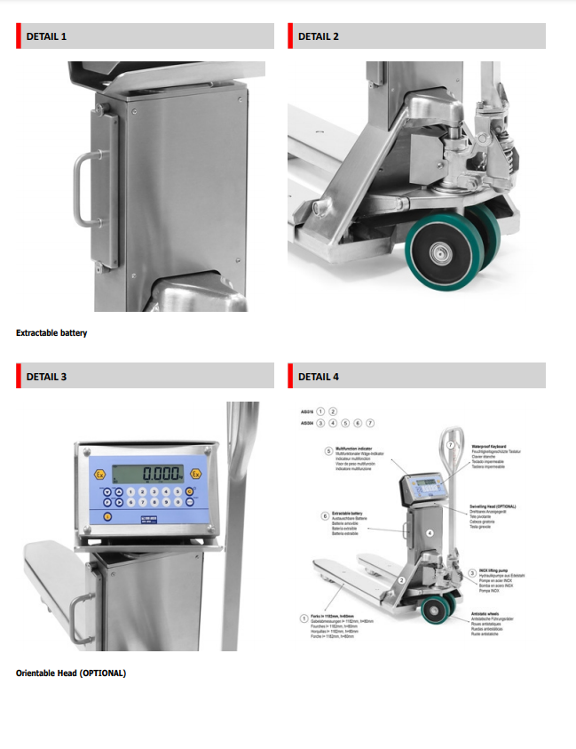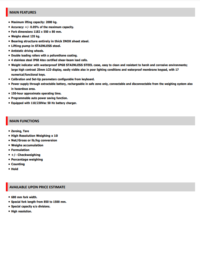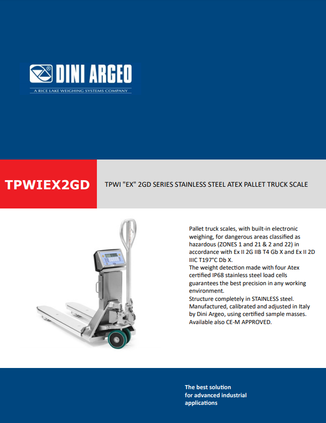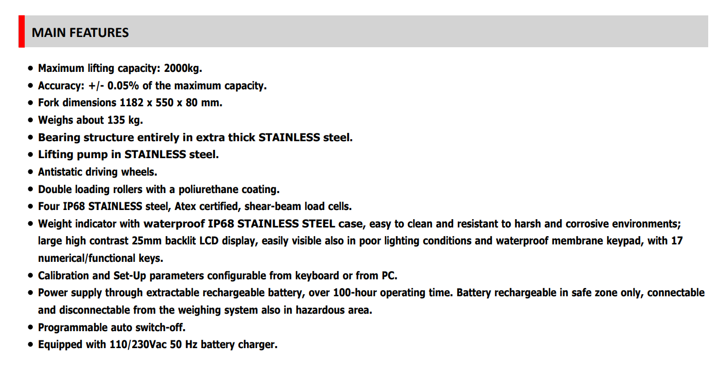 Παλετοφόρο, με ενσωματωμένο ηλεκτρονικό ζύγισμα, κατάλληλο για σκληρές συνθήκες εργασίας και επικίνδυνες περιοχές που ταξινομούνται ως επικίνδυνες (ΖΩΝΗ 2, 22) σύμφωνα με την προστασία Ex II 3G IIC T6 Gc X και Ex II 3D IIIC T115C ° Dc X. Η ανίχνευση βάρους με τέσσερα πιστοποιημένα από Atex ανοξείδωτο χάλυβα IP68 εγγυάται την ακρίβεια σε όλες τις συνθήκες εργασίας. Δομή εξ ολοκλήρου από ανοξείδωτο ατσάλι. Κατασκευάστηκε, βαθμονομήθηκε και προσαρμόστηκε στην Ιταλία από τον Dini Argeo, χρησιμοποιώντας πιστοποιημένες μάζες δείγματος. Διατίθεται επίσης ΕΓΚΡΙΣΗ CE-M.