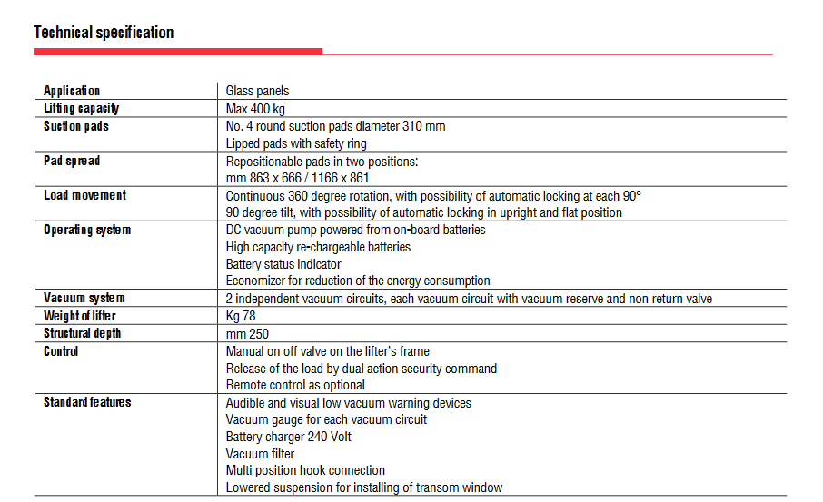 • Battery powered vacuum lifters are suplied complete of 220 Volt battery charger.