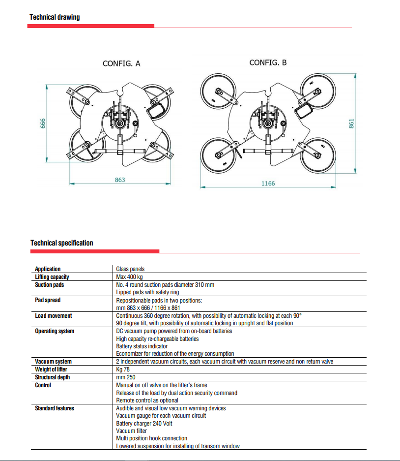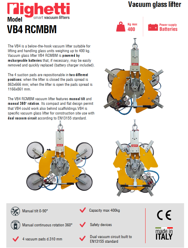 VB4 is specific vacuum glass lifter for construction site use with dual vacuum circuit according to EN13155.