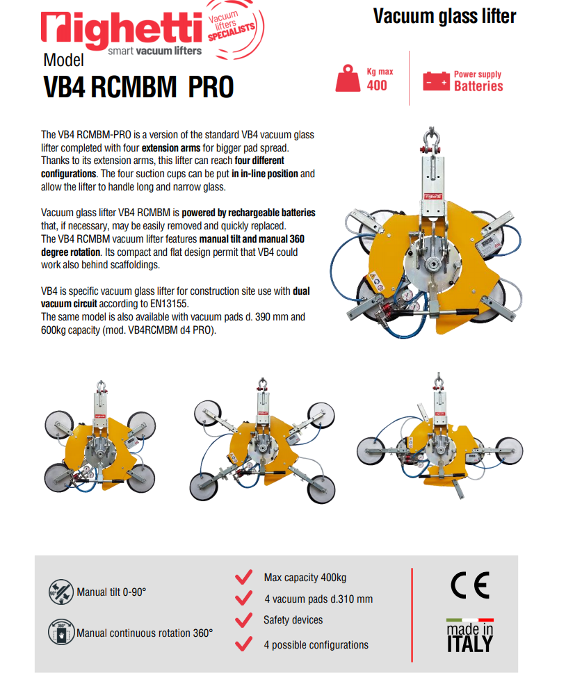 - The VB4 RCMBM-PRO is version of standard VB4 vacuum glass lifter but complete of extension arms for bigger pad spread. Thanks to extension arms, the suction cups have four difefrent positions from mm 863x666 to mm 1535x1100.