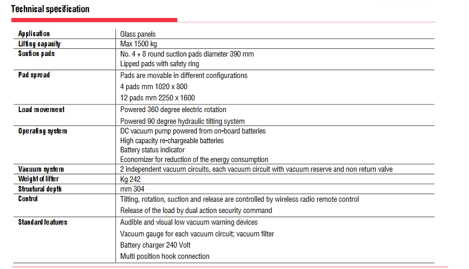 The vacuum lifter features a dual vacuum circuit to be safely used on construction site, as required by EU laws EN13155. Moreover, it is equipped with a smart vacuum control unit which constantly monitors the level of vacuum in the circuits and signals potential dangers to the workers thanks to audio-visual alarms.