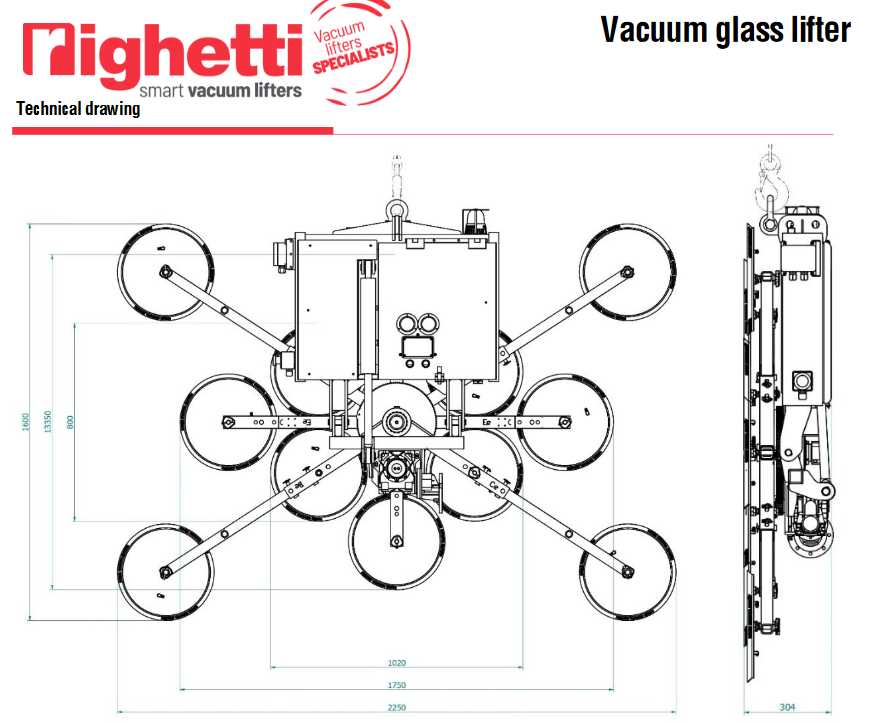 GLE4+8 counts a total of 12 suction pads, 4 on the vacuum lifter’s body and 8 on removable extensions. The extensions permit to change the lifter’s configuration and lifting capacity for adapting to different glass dimensions.