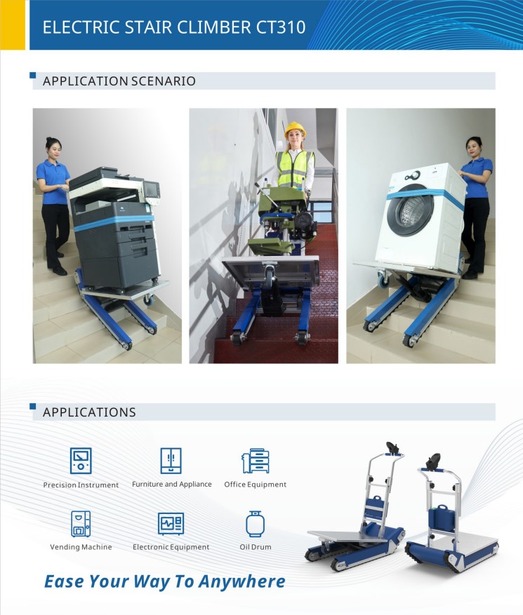 Το καρότσι CT310 με ικανότητα αναρρίχησης 310 kg ,επιτρέπει σε ένα μόνο άτομο να μεταφέρει εμπορεύματα πάνω και κάτω στις σκάλες με εξαιρετική ευκολία.