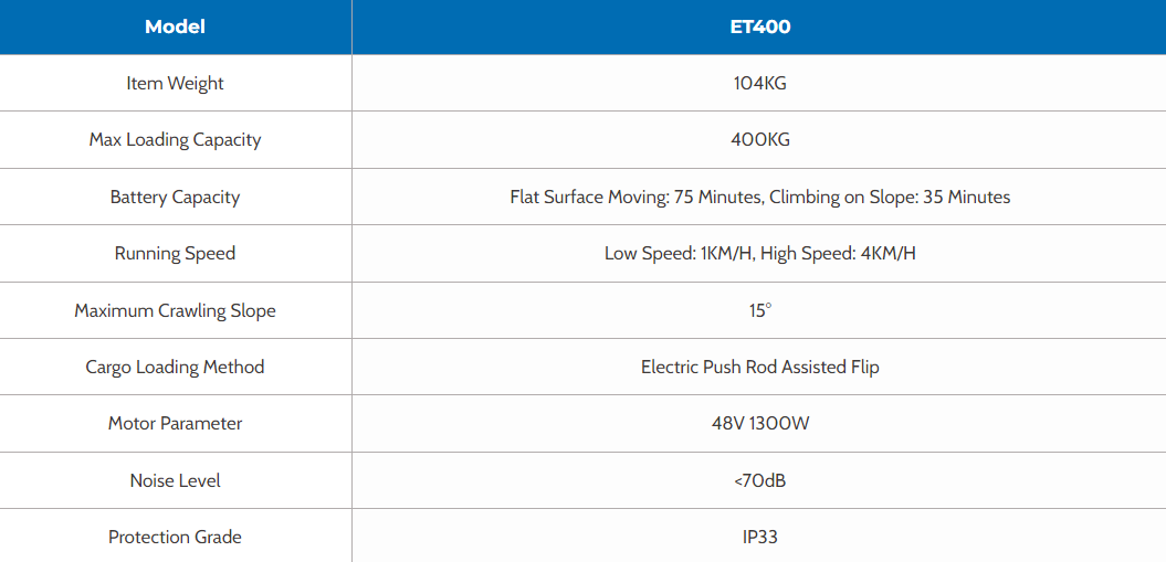 - Το καρότσι της xsto ET-400W3 είναι ένα καινοτόμο προιόν που μπορεί να παραλάβει,ανυψώσει και μεταφέρει με ηλεκτρική πρόωση ένα βαρύ αντικείμενο εώς 400 kg!
