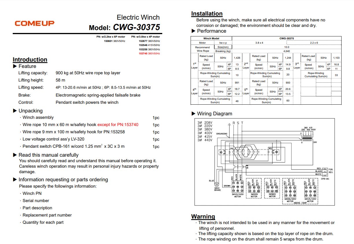 COME UP CWG-30375 | Τριφασικό βαρούλκο με συρματόσχοινο 58 m 900 kg ανύψωση λειτουργίας 380 V