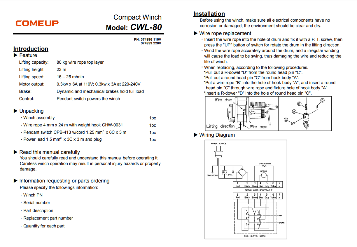 - COME UP CWL-80 | Μονοφασικό βαρούλκο συρματόσχοινου | 80 kg
