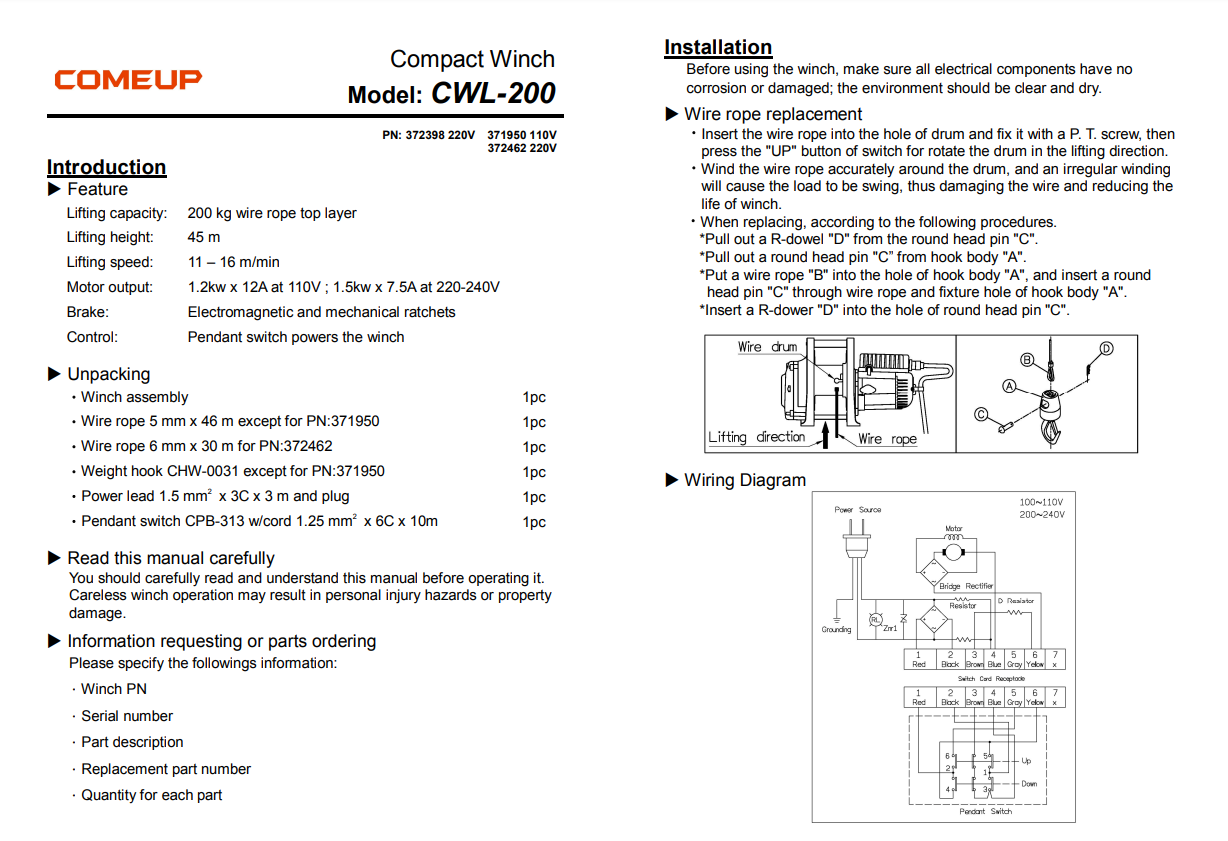 - COME UP CWL-200 | Μονοφασικό βαρούλκο συρματόσχοινου | 200 kg