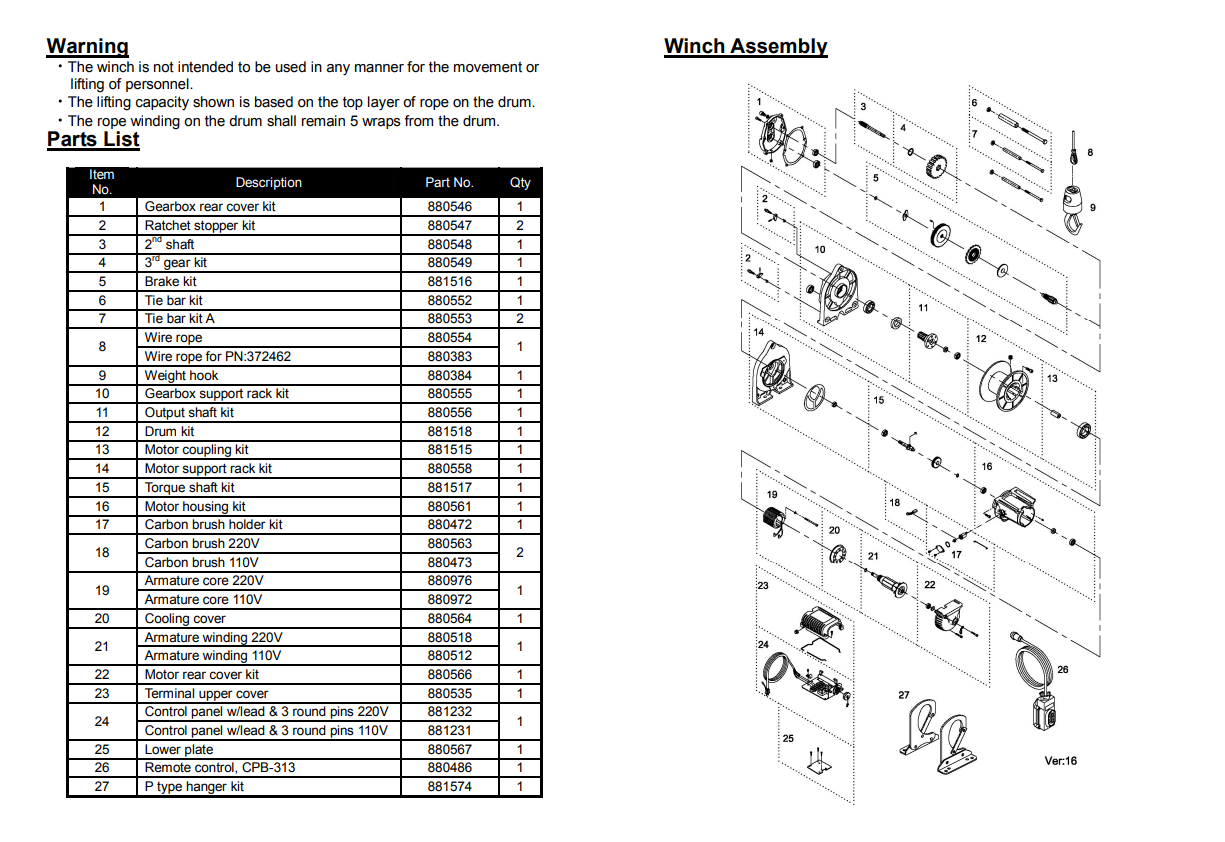 - The winch is not intended to be used in any manner for the movement or lifting of personnel.