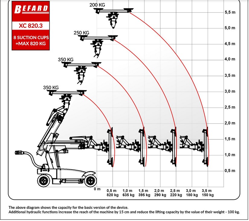 • Τα ρομπότ BEFARD XC820, έχουν τη δυνατότητα πλευρικής κίνησης του πλαισίου βεντούζας κατά 100 mm, μια τέτοια λύση επιτρέπει τη λειτουργία του υδραυλικού κυλίνδρου πλευρικής κίνησης για ακριβή τοποθέτηση του παραθύρου στο άνοιγμα του παραθύρου. Η απόσταση των βεντουζών μπορεί επίσης να αυξηθεί, για να αποκτήσετε μεγαλύτερη ή μικρότερη επιφάνεια ανάλογα με τις ανάγκες και το μέγεθος του τζαμιού που θα μεταφερθεί.