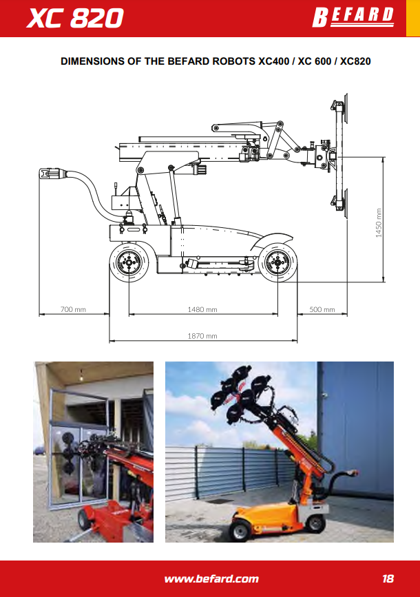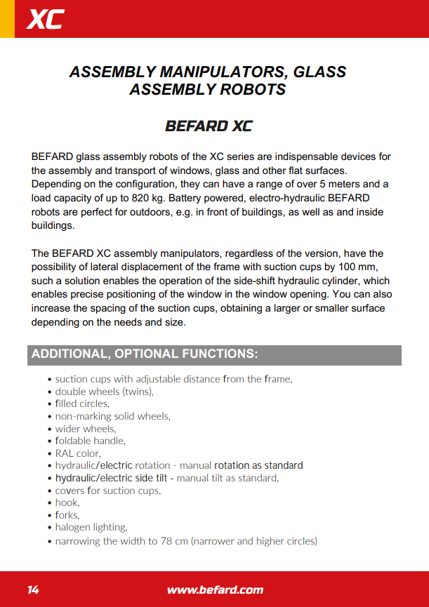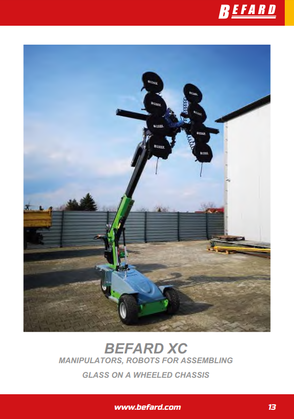 •  Τα  ρομπότ της σειράς BEFARD XC820 για τζάμια είναι αναντικατάστατες συσκευές για την τοποθέτηση και τη μεταφορά παραθύρων, γυαλιού και άλλων επίπεδων επιφανειών. Τα ρομπότ με μπαταρία, ηλεκτρικά και υδραυλικά BEFARD XC820 είναι ιδανικά τόσο για εξωτερική χρήση (π.χ. μπροστά από κτίρια) όσο και για εσωτερικούς χώρους.