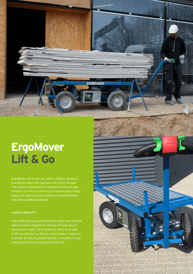 - Το ErgoMover Lift & Go είναι το αυθεντικό τρόλεϊ με ηλεκτρική κίνηση και υδραυλική ανύψωση της πλατφόρμας, το οποίο έχει αναπτυχθεί για να αντικαταστήσει τους χειροκίνητους φορείς γυψοσανίδας και να βοηθήσει τους πολλούς χειροκίνητους ανελκυστήρες που πραγματοποιούνται συχνά σε ένα εργοτάξιο.