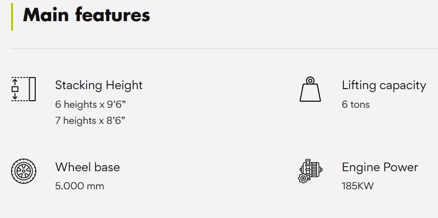 <Το TUP 6-ECL είναι ένας χειριστής κενών Container χωρητικότητας 6 τόνων και στοιβάζει δοχεία 6 x 9'6" και δοχεία 7 x 8'6" ύψος.
