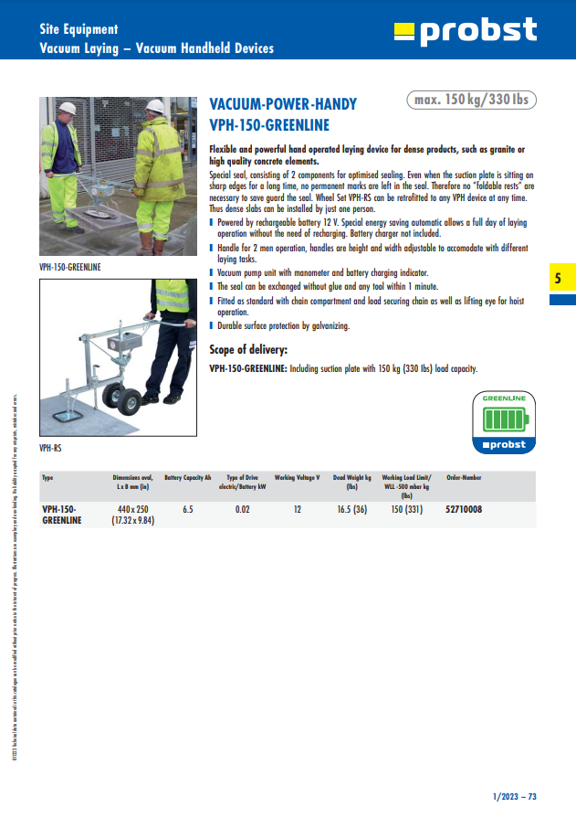 PROBST VPH-150 | Ισχυρή ανυψωτική βεντούζα χειρός για επαγγελματική μεταφορά και τοποθέτηση κρασπέδων έως 150 kg