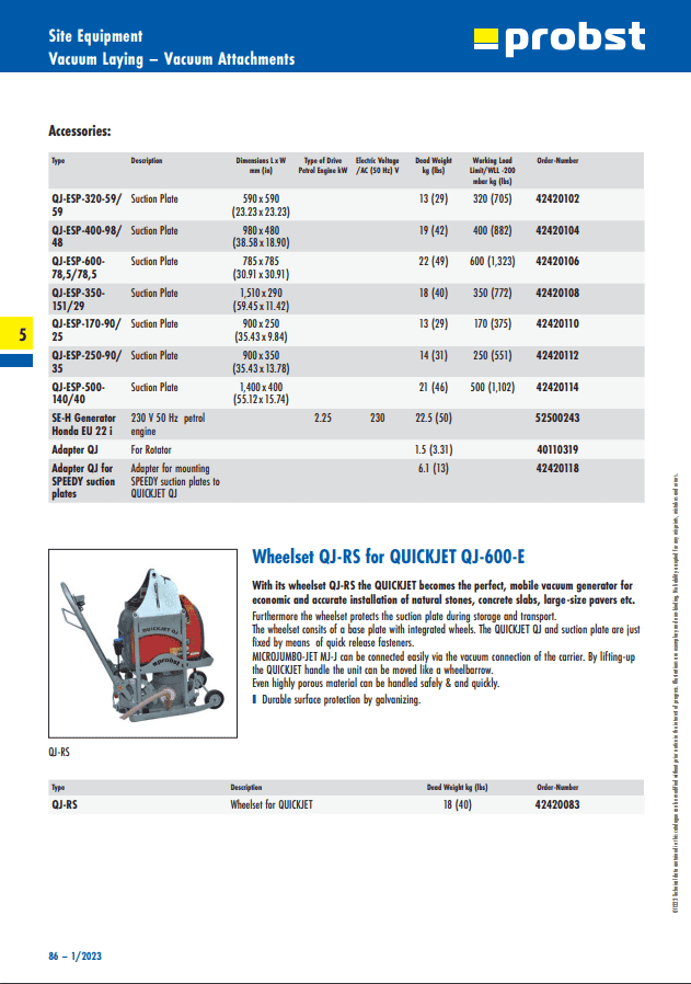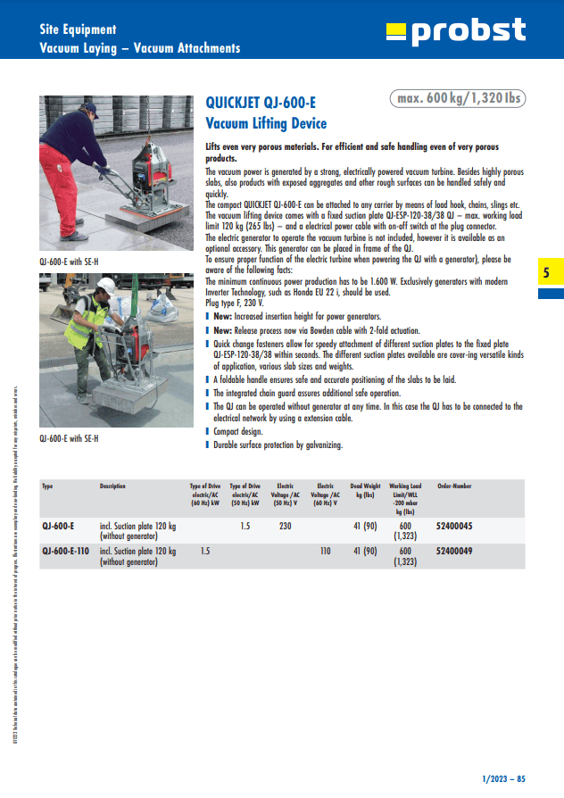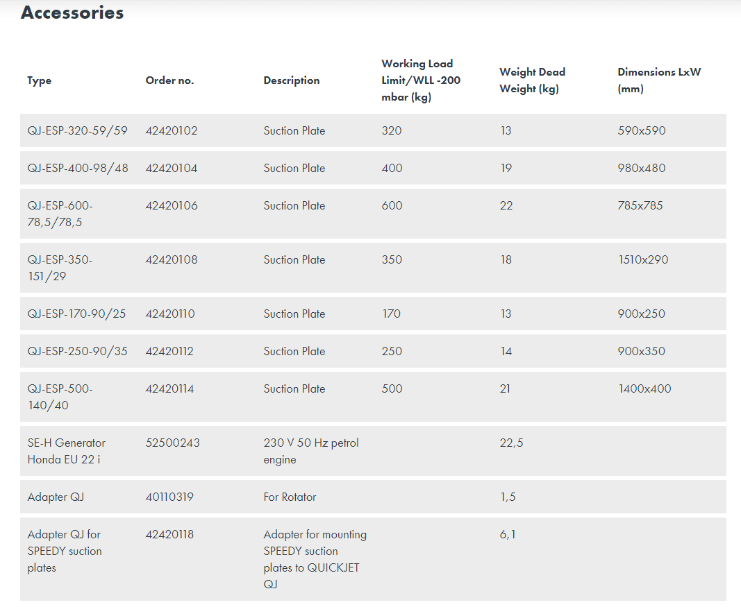 - The vacuum lifting device comes with a fixed suction plate QJ-ESP-120-38/38 QJ – max. working load limit 120 kg (265 lbs) – and a electrical power cable with on-off switch at the plug connector.