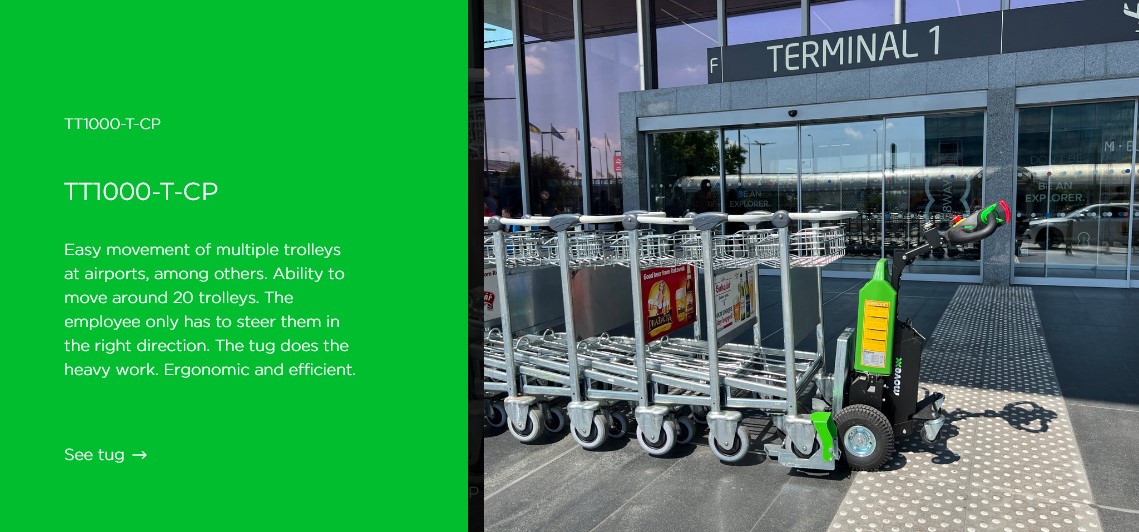 Το TT1000-T-CP είναι ένα εργονομικό ηλεκτρικό βοήθημα μεταφοράς που επιτρέπει σε 1 άτομο να μεταφέρει έως και 20 καροτσάκια αγορών κάθε φορά με πολύ μικρή σωματική προσπάθεια.