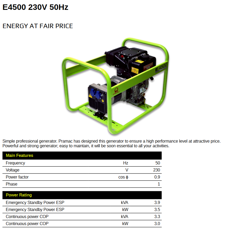 GENERATOR SERIES E4500 230V 3.9 kVA