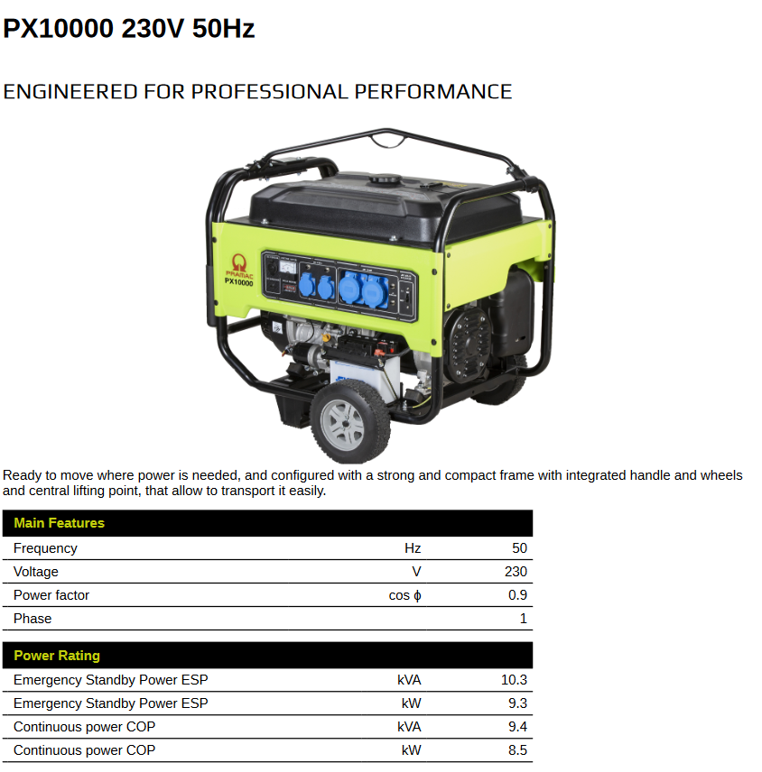 Η Pramac παρουσιάζει τη σειρά PX, σχεδιασμένη για επαγγελματική απόδοση. Έτοιμη για κίνηση όπου χρειάζεται ρεύμα. Διαμορφωμένη με ένα ισχυρό και συμπαγές πλαίσιο με ενσωματωμένη λαβή και τροχούς, που επιτρέπει την εύκολη μεταφορά της. Τα εξαρτήματα PX Gensets έχουν σχεδιαστεί για να βασίζονται σε μιαμακροχρόνια επαγγελματική γεννήτρια, με ηχομονωτικά πλαϊνά πάνελ που εγγυώνται τις καλύτερες συνθήκες εργασίας.