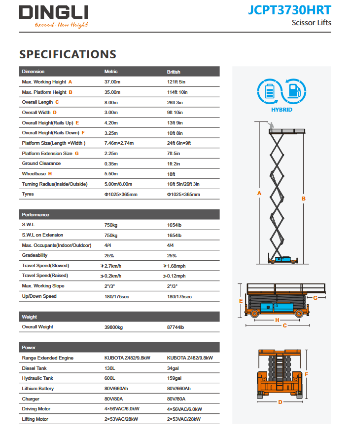 Dingli JCPT3730HRT | Υβριδική ψαλιδωτή πλατφόρμα εργασίας με ύψος εργασίας 37 μέτρα και ανυψωτική ικανότητα 750 κιλά