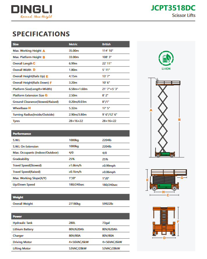 Dingli JCPT3518DC | Ηλεκτρική ψαλιδωτή πλατφόρμα εργασίας με ύψος εργασίας 35 μέτρα και ανυψωτική ικανότητα 1000 κιλά