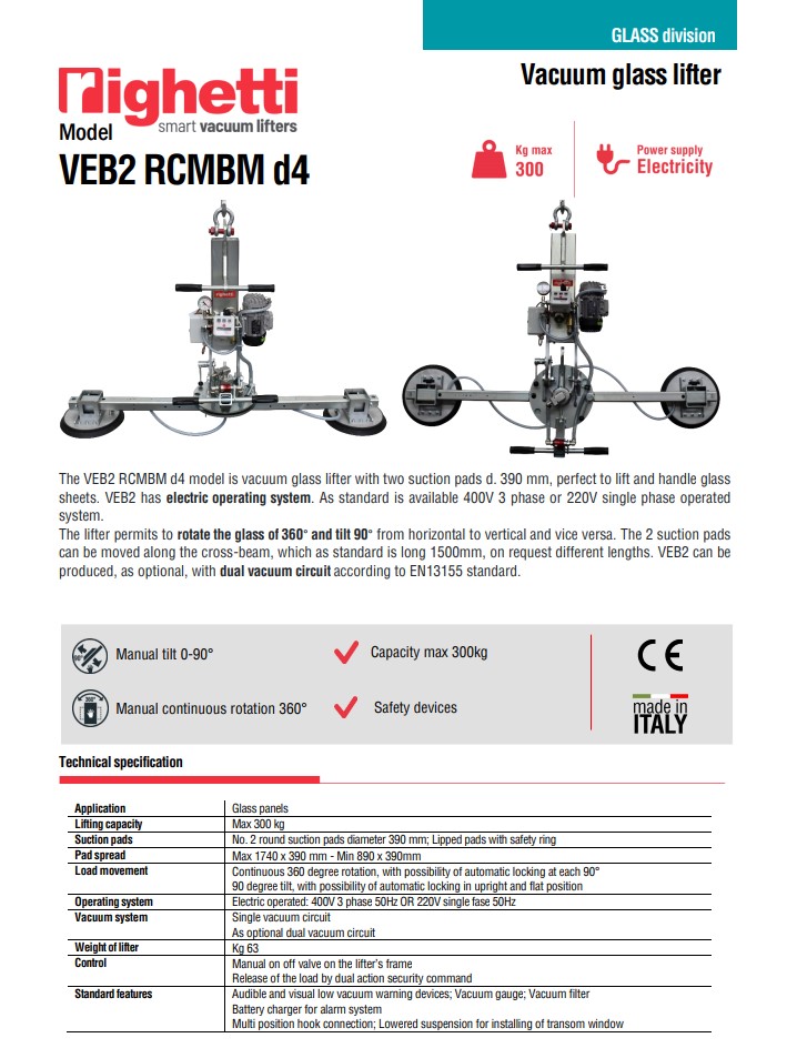 - Το μοντέλο VEB2 RCMBM d4 είναι ανυψωτικό γυαλί κενού με δύο επιθέματα αναρρόφησης d. 390 mm, ιδανικό για ανύψωση και χειρισμό γυάλινων φύλλων.