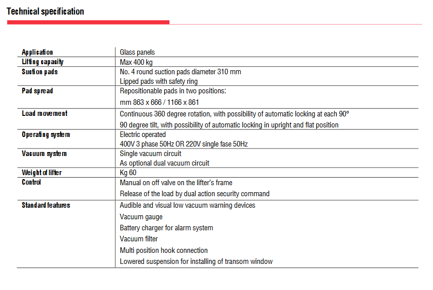 - Το μοντέλο VEB4 RCMBM είναι ανυψωτικό γυαλιου κενού με τέσσερις βεντούζες d. 310 mm, ιδανικό για ανύψωση και χειρισμό γυάλινων φύλλων.