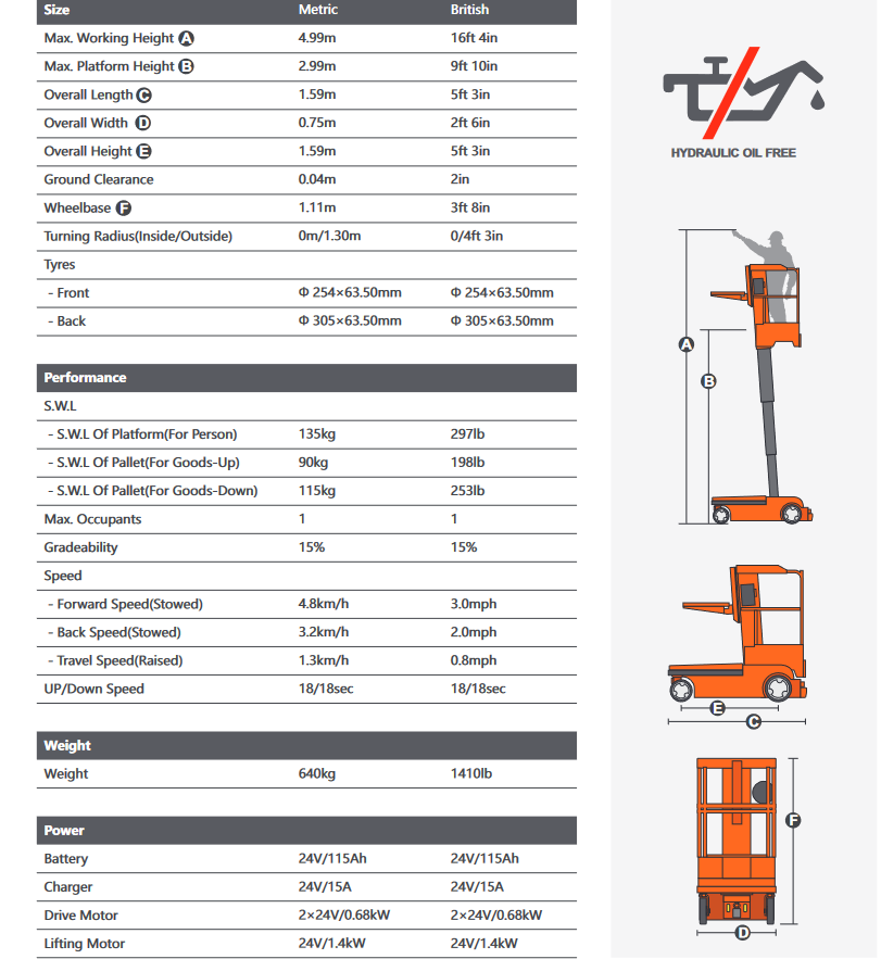 Dingli OPT0507 | Electric personnel lift with working height 4.99m and lifting capacity 135kg