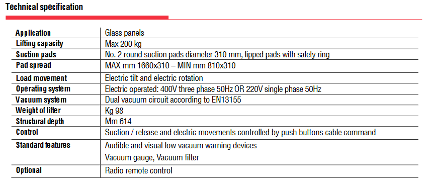 Το μοντέλο VEB2 RCEBE είναι ανυψωτικό βεντούζα γυαλιού με ηλεκτρικές κινήσεις και μέγιστη ικανότητα ανύψωσης 200 κιλών. Το VEB2 RCEBE διαθέτει τροφοδοτούμενη κλίση 0 – 90° και τροφοδοτούμενη συνεχή περιστροφή 360°. Οι εντολές αναρρόφησης, απελευθέρωσης, κλίσης και περιστροφής ελέγχονται με την εντολή καλωδίου κουμπιού (το τηλεχειριστήριο διατίθεται προαιρετικά).
