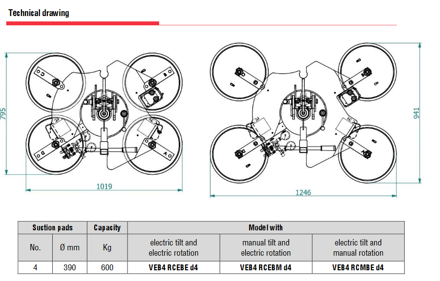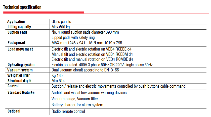 Το μοντέλο VEB4 RCEBE d4 είναι μια βεντούζα ανύψωσης γυαλιού με ηλεκτρικές κινήσεις και ανυψωτική ικανότητα 600kg. Το VEB4 RCEBE d4 διαθέτει τροφοδοτούμενη κλίση 0 – 90° και τροφοδοτούμενη συνεχή περιστροφή 360°. Οι εντολές αναρρόφησης, απελευθέρωσης, κλίσης και περιστροφής ελέγχονται με την εντολή καλωδίου κουμπιού (τηλεχειριστήριο ως προαιρετικό). Η βεντούζα ανύψωσης γυαλιού VEB4 RCEBE d4 είναι ηλεκτρική, μπορεί να παραχθεί με τάση 220V μονοφασική ή 400V τριφασική , 50Hz. Αυτό το μοντέλο μπορεί να χρησιμοποιηθεί στον χώρο παραγωγής, αλλά και στο εργοτάξιο, καθώς διαθέτει διπλό κύκλωμα κενού σύμφωνα με το EN13155. . Αυτό το ανυψωτικό διατίθεται επίσης με ηλεκτρική περιστροφή και χειροκίνητη κλίση (VEB4 RCEBM d4). ή με χειροκίνητη περιστροφή και ηλεκτρική κλίση (VEB4 RCMBE d4)