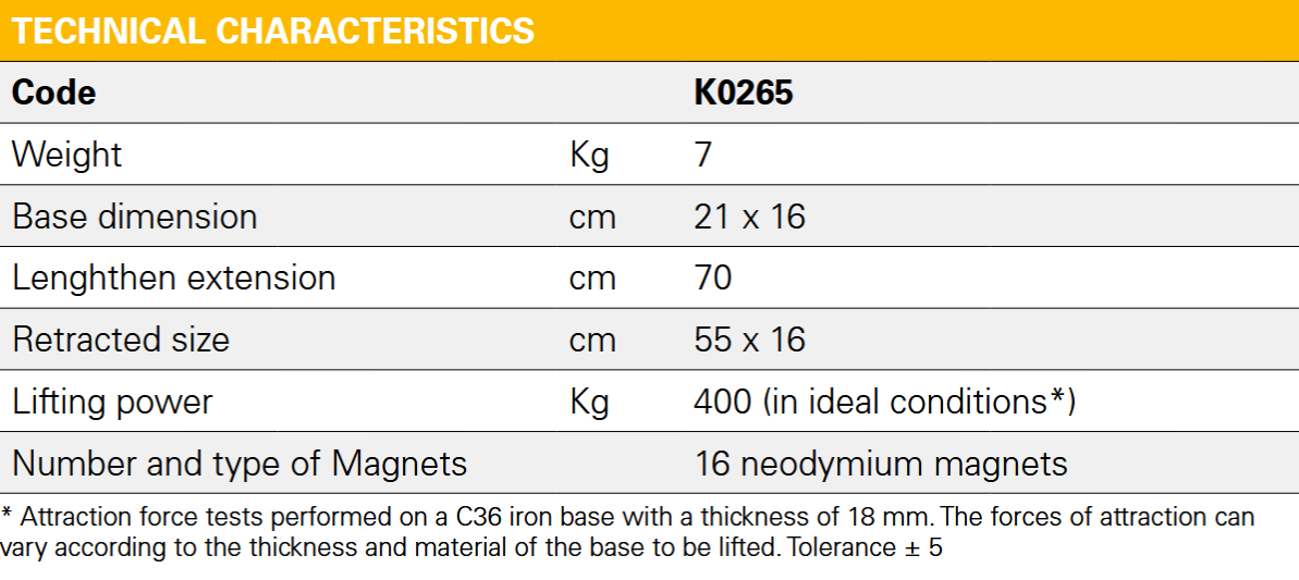 Η πλάκα με 16 ισχυρούς μαγνήτες νεοδυμίου εξασφαλίζει δύναμη ανύψωσης 300 κιλών με βάρος μόνο 7 κιλά. Η χρήση είναι απλή, γρήγορη και διαισθητική.