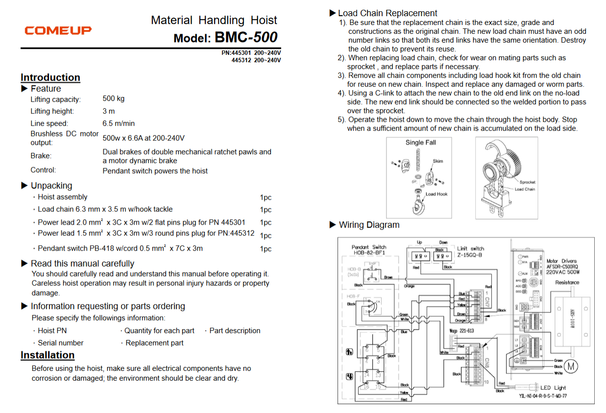- COME UP BMC-500 | Μονοφασικό Βαρούλκο αλυσίδας χωρίς ψύκτρες | 500 kg