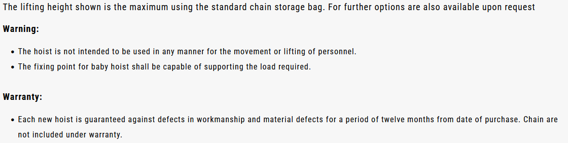 - Συμμόρφωση με τα πρότυπα: CE Machinery Directive 2006/42/EC, CE EMC Directive 2014/30/EU, EN 14492-2 Power Driven hoists 2006, JIS B8815, ISO 4301-1 και ASME B30.7.