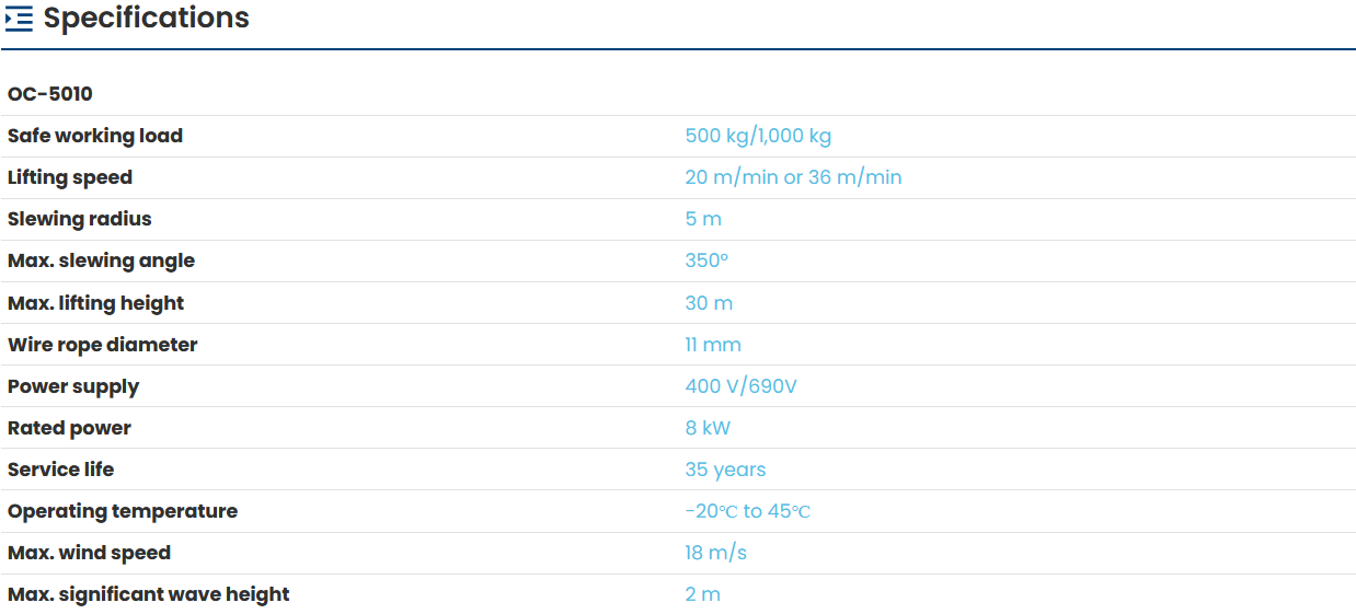 Ο γερανός 3S LIFT Offshore Davit Crane, ειδικά σχεδιασμένος για πλατφόρμες αιολικών τουρμπίνων σε θαλάσσιες εγκαταστάσεις, αποτελεί αξιόπιστη λύση για ασφαλή και αποτελεσματική φόρτωση και εκφόρτωση ανταλλακτικών από και προς τα εφοδιαστικά πλοία στη θάλασσα. Με διάρκεια ζωής πάνω από 30 χρόνια, διαθέτει εξαρτήματα υψηλής ποιότητας προσαρμοσμένα στο σκληρό θαλάσσιο περιβάλλον, εγγυώντας ανώτατη ασφάλεια, αξιοπιστία και ενίσχυση με πολλαπλές θεραπείες κατά της διάβρωσης.