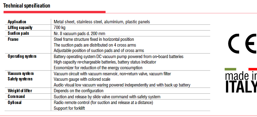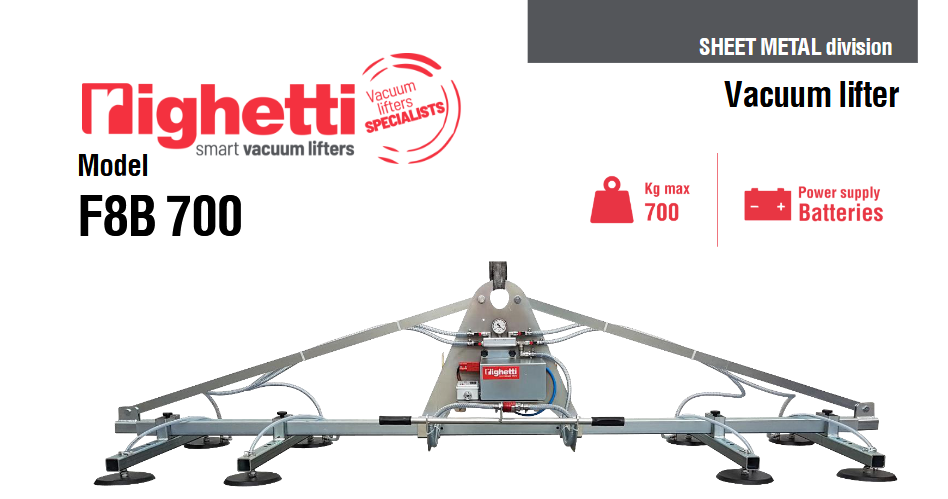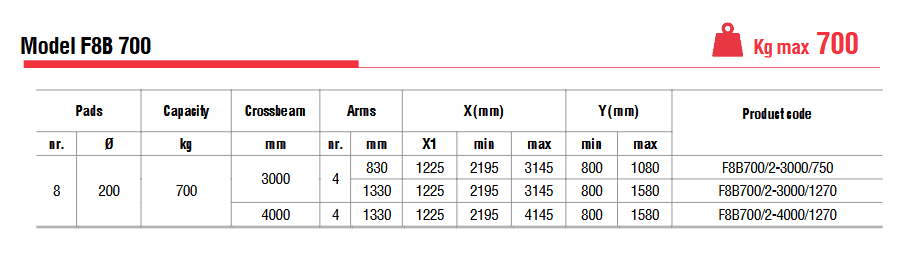 Το F8B 700 έχει μέγιστη χωρητικότητα 700 kg και 8 βεντούζες κατανεμημένες σε 4 σταυρούς βραχίονες.