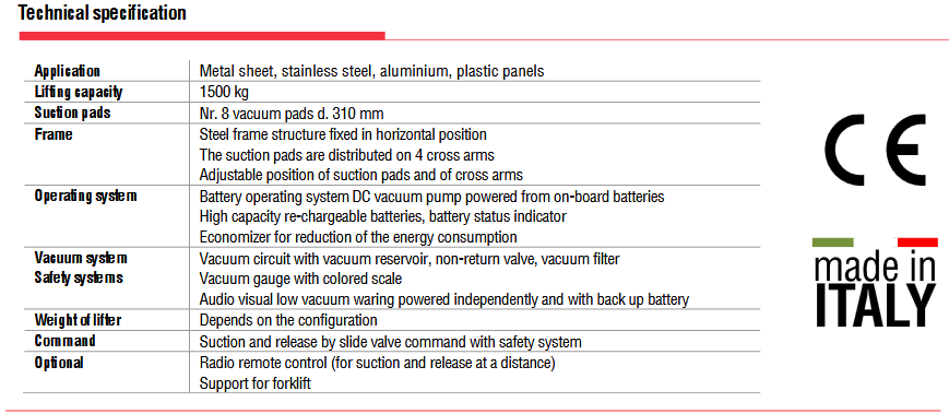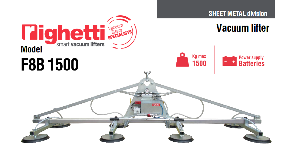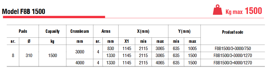Το F8B 1500 έχει μέγιστη χωρητικότητα 1500 kg και 8 βεντούζες κατανεμημένες σε 4 σταυρούς βραχίονες.