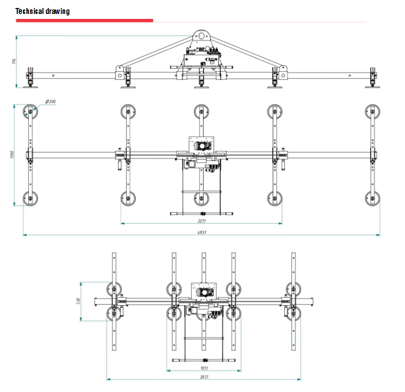 Being its length adjustable from 2651mm to 4897mm, it is the perfect vacuum lifter for handling sheet metal of variable dimensions such as 6000x2000mm, 4000x2000mm and 3000x1500mm.