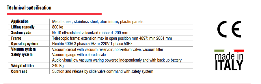 Its 10 suction pads, specific for sheet metal, are made of special oil-resistant vulcanized rubber, placed on five cross-arms to assure firm hold and support on even the longest sheet metal.